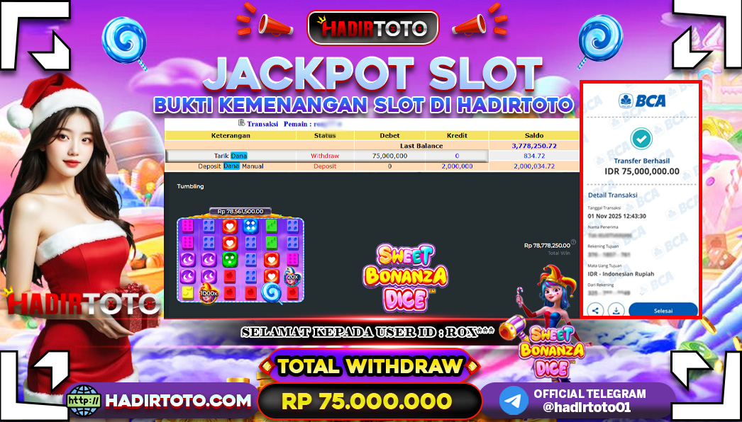 ꧁༒☬👑HADIRTOTO👑☬༒꧂ Jackpot 🐋 SWEET BONANZA DICE ~ RP.75.000.000.,- LUNAS