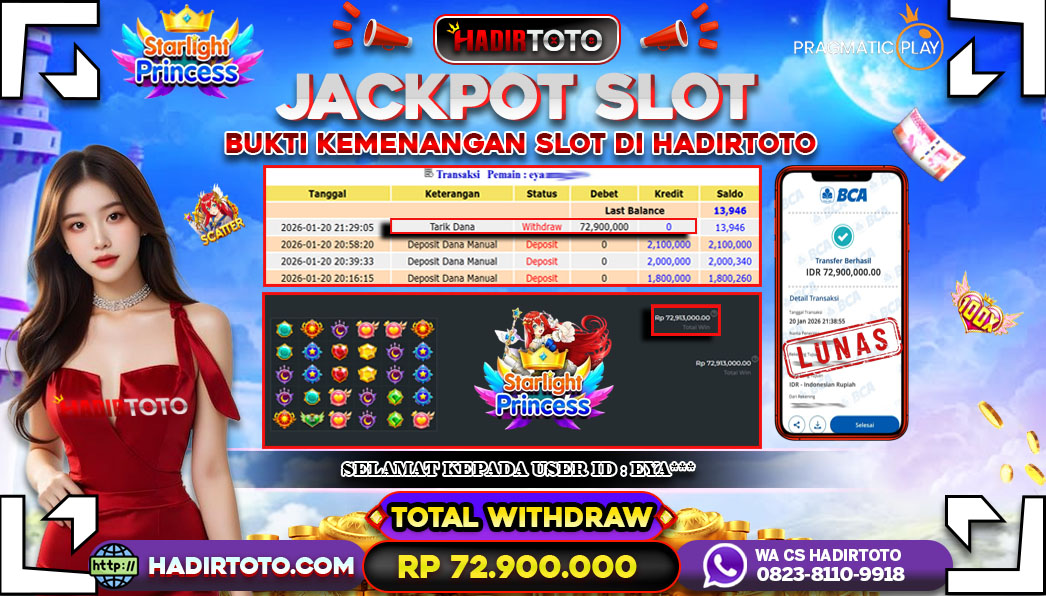 Selamat Kepada Member 𓆩♕𓆪 HADIRTOTO 𓆩♕𓆪 Yang Telah Berhasil Meraih Kemenangan dengan ID : EYA*** di permainan SLOT Starlight Princess dengan kemenengan sebesar Rp.72.900.000 , Setelah mengisi formulir withdraw dengan kurung waktu hanya 5 – 10 menit pihak hadirtoto sudah melakukan transfer kepada pemilik Userid dan dana sudah dapat di cairkan oleh pemenang. Bukti pembayaran yang kami berikan merupakan bukti pembayaran yang SAH / VALID yang langung di dapatkan melalui tanda transfer transaksi dari Bank yang di tuju. Kami mengucapakan banyak Terima Kasih Kepada pemenang karena sudah mempercayakan kami sebagai Bandar Tepercaya yang membayar semua kemenangan member hingga lunas. Masih ragu dengan hadirtoto kak ? Di mana bandar togel online sekarang yang terpercaya seperti hadirtoto? Bandar yang mengirimkan kemenangan member tanpa bertele – tele. Jadi…. tidak perlu khawatir pada situs hadirtoto karena kemenangan anda berapapun akan dibayarakan hingga lunas kepada pemenang.