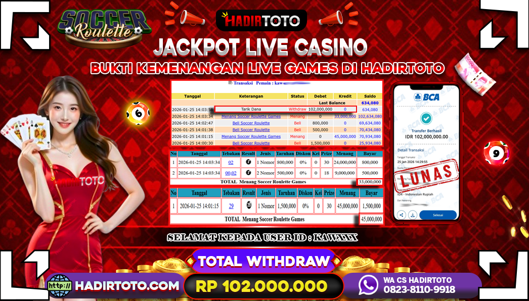 ꧁༒☬👑HADIRTOTO👑☬༒꧂ Jackpot 🐋 LIVE GAMES SOCCER ROULETTE ~ RP.102.000.000.,- LUNAS