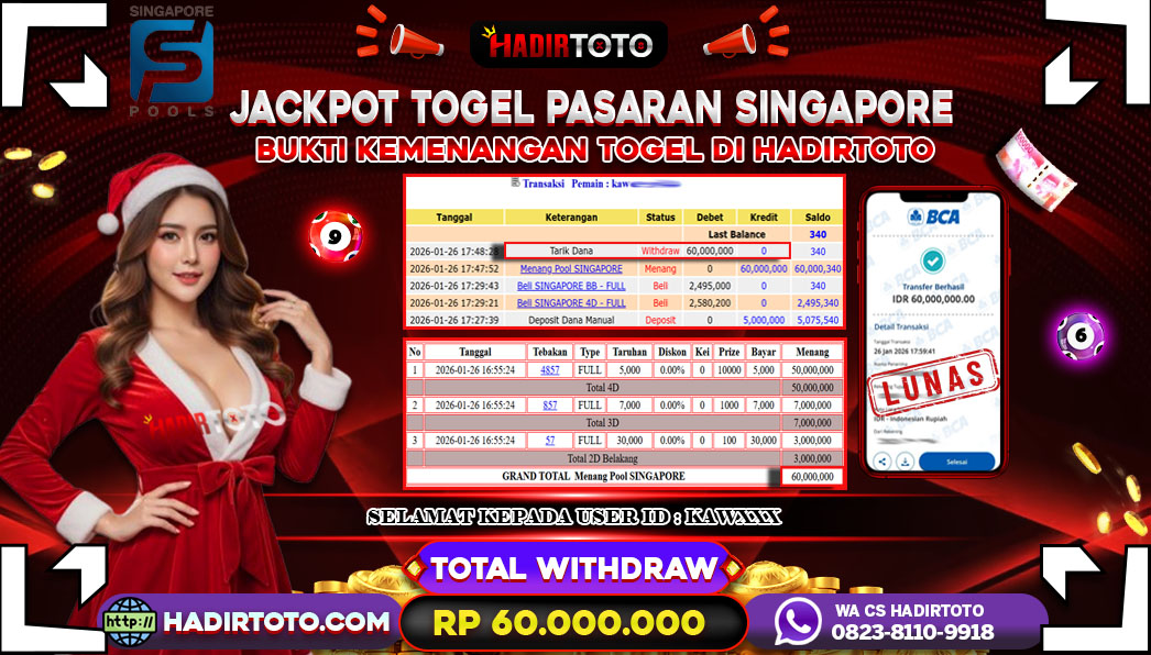 ꧁༒☬👑HADIRTOTO👑☬༒꧂ Jackpot 🐋 TOGEL PASARAN SINGAPORE POOLS ~ RP.60.000.000.,- LUNAS