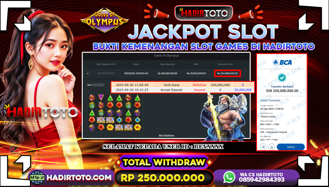 ꧁༒☬👑HADIRTOTO👑☬༒꧂ Jackpot 🐋 SLOT Gates of Olympus ~ RP.250.000.000.,- LUNAS