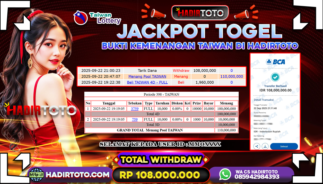 ꧁༒☬👑HADIRTOTO👑☬༒꧂ Jackpot 🐋 TOGEL Taiwan ~ RP.108.000.000.,- LUNAS
