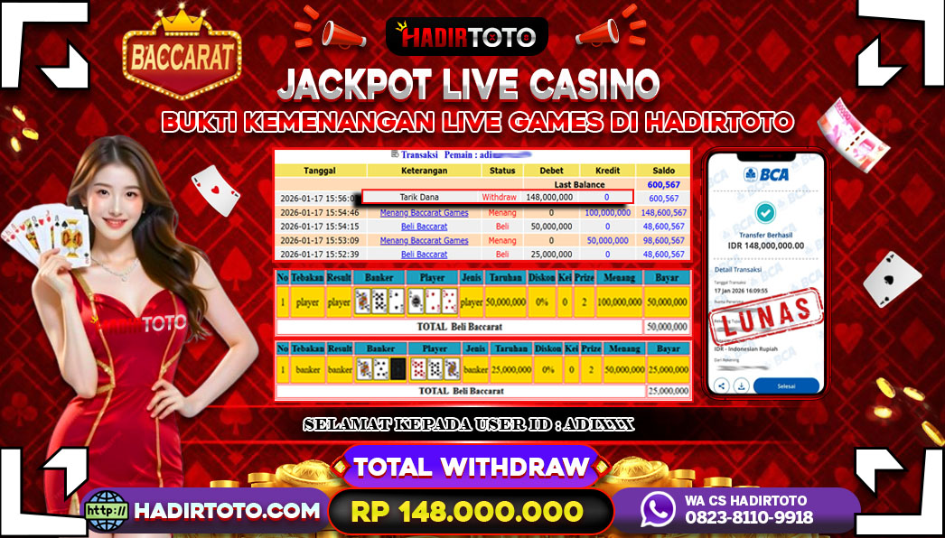 ꧁༒☬👑HADIRTOTO👑☬༒꧂ Jackpot 🐋 LIVE GAMES BACCARAT ~ RP.148.000.000.,- LUNAS